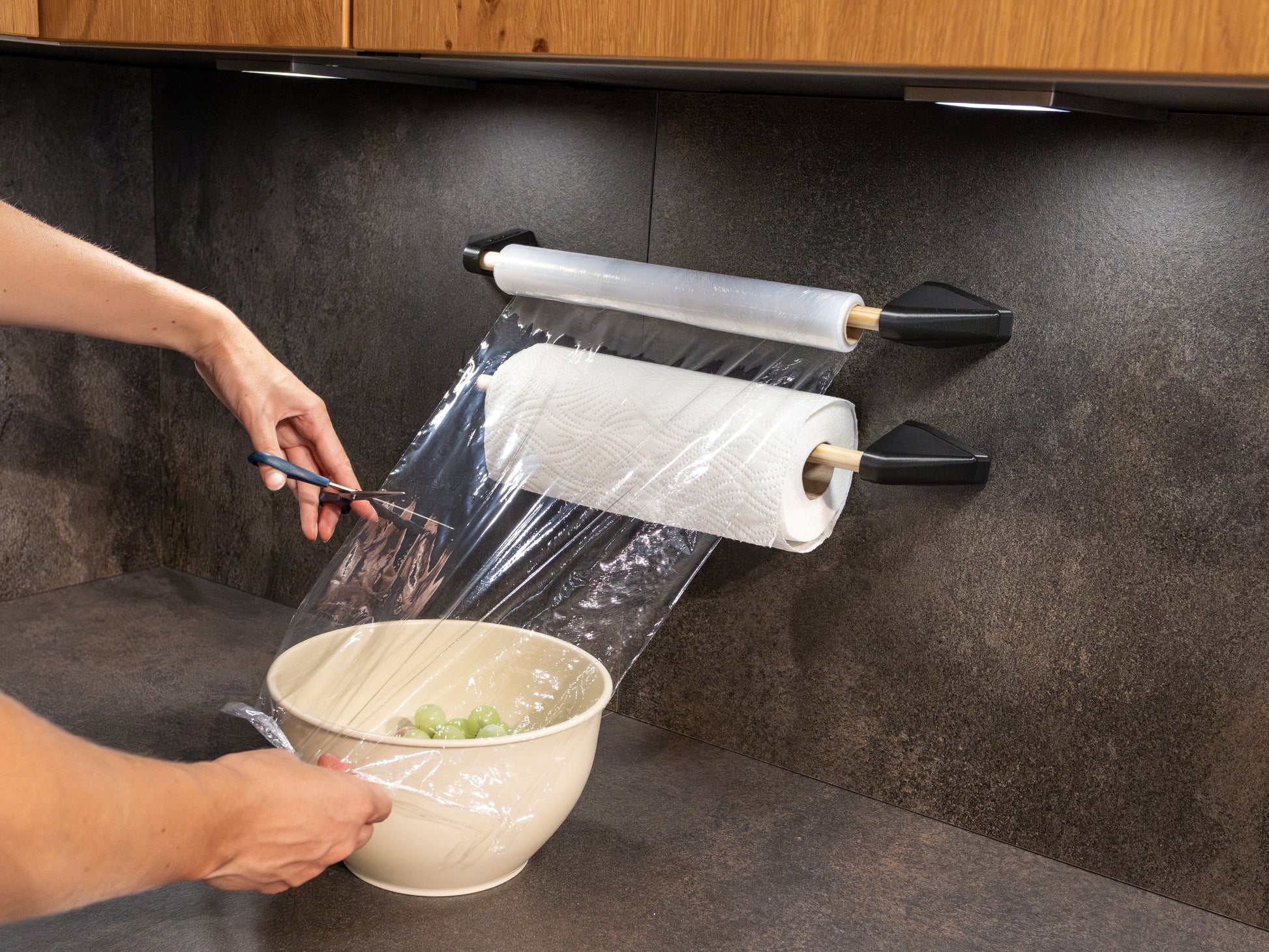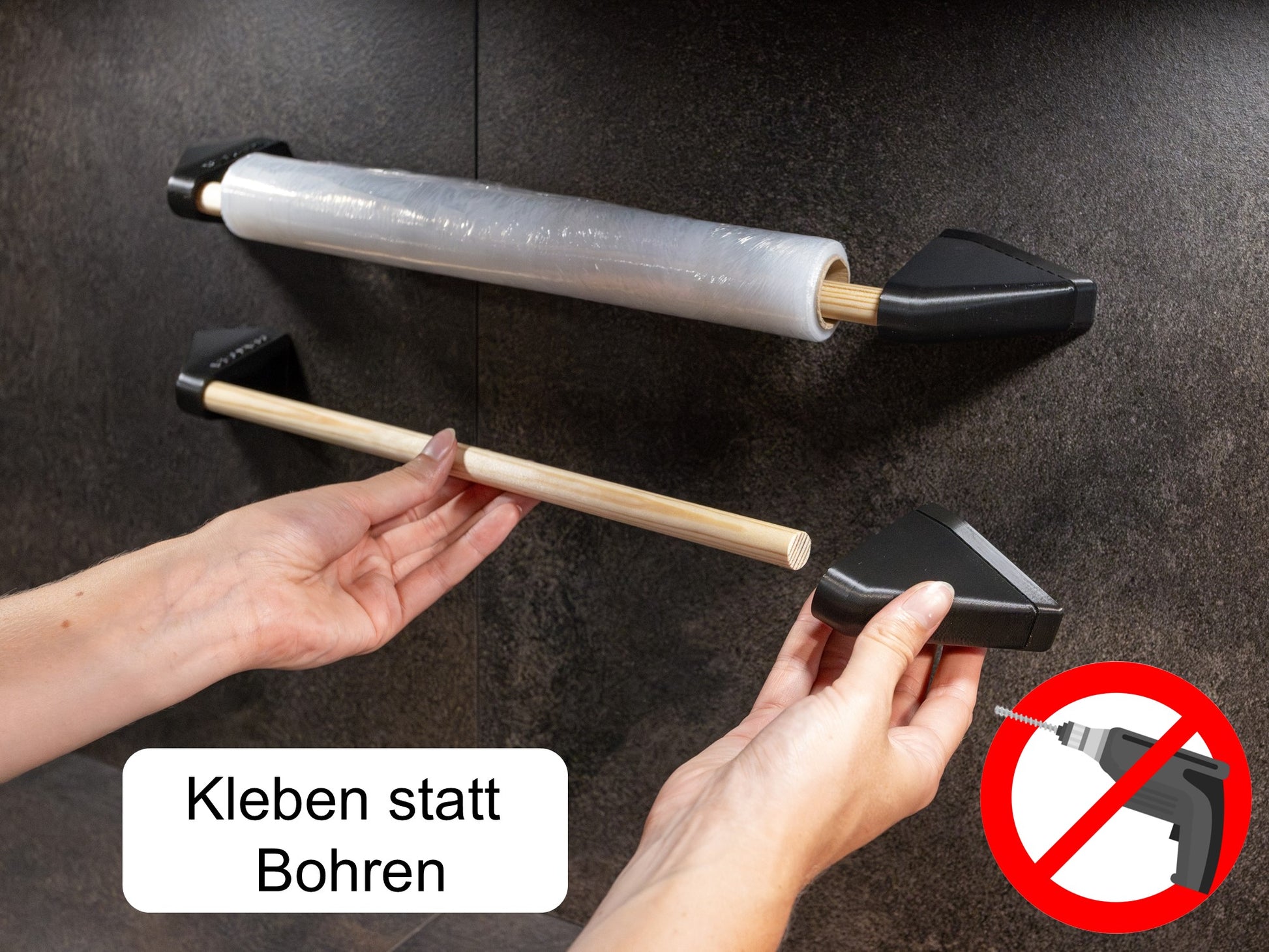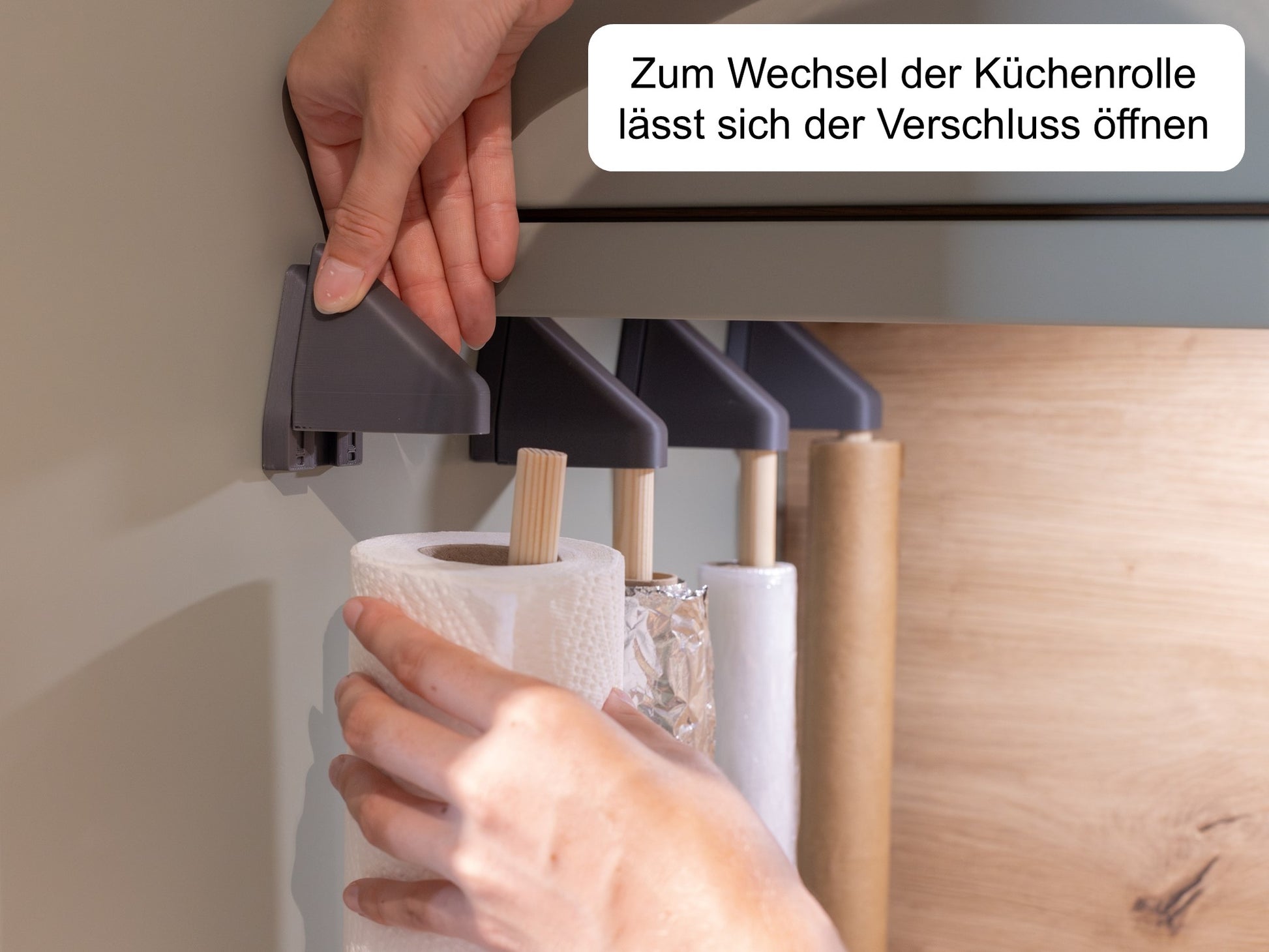 Mein Halter für Küchenrollen, Alufolie, Backpapier oder Frischhaltefolie hilft dir, Ordnung in deine Küche zu bringen. Er schafft Platz in deinen Schubladen oder Schränken und gibt deinen Küchenrollen, deiner Alufolie, Backpapier oder Frischhaltefolie einen eigenen Aufbewahrungsort, wo sie sofort griffbereit zur Verfügung stehen. Anders als stehende Küchenrollenhalter verbraucht meiner keinen Platz auf deiner eh schon knappen Arbeitsfläche.