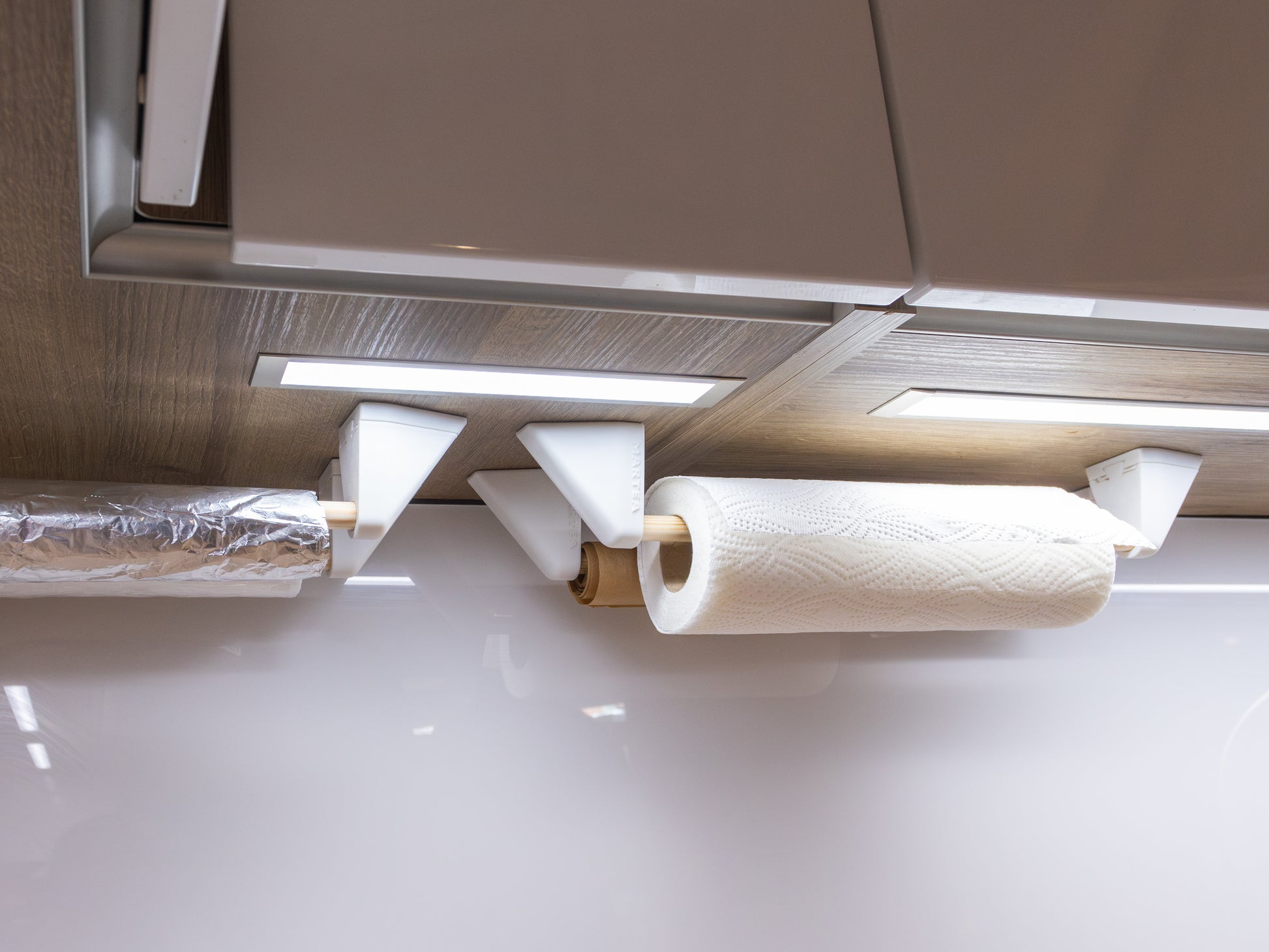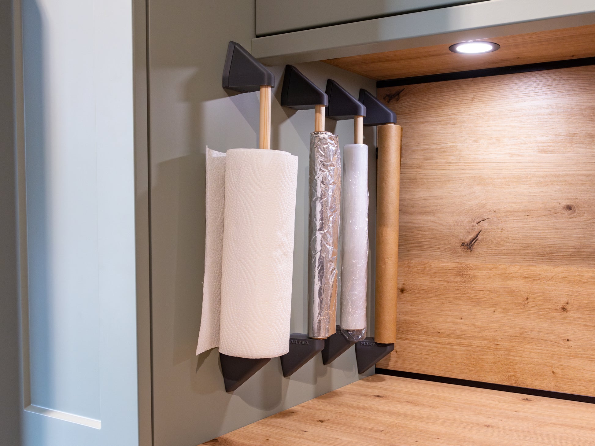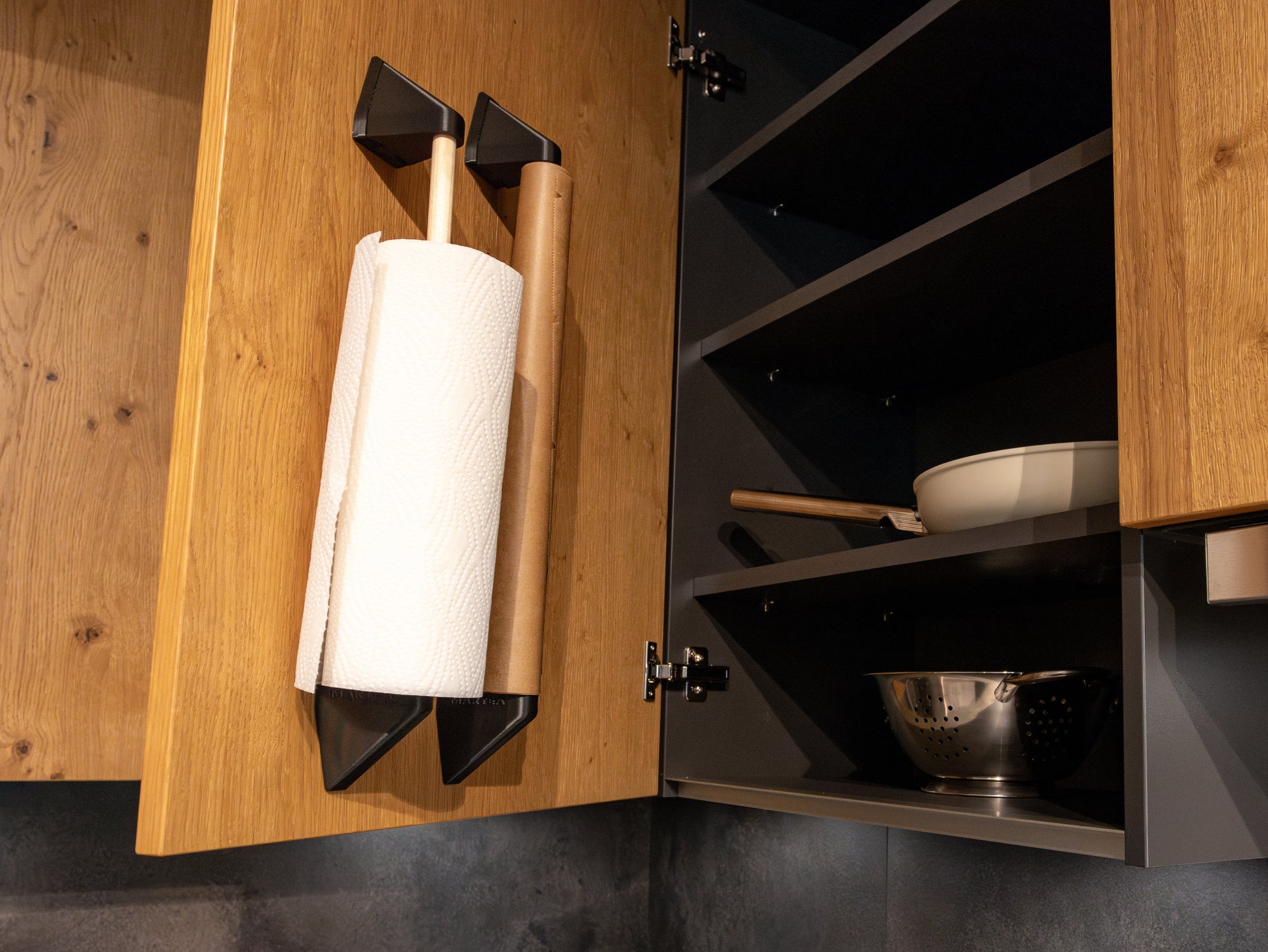 Mein Halter für Küchenrollen, Alufolie, Backpapier oder Frischhaltefolie hilft dir, Ordnung in deine Küche zu bringen. Er schafft Platz in deinen Schubladen oder Schränken und gibt deinen Küchenrollen, deiner Alufolie, Backpapier oder Frischhaltefolie einen eigenen Aufbewahrungsort, wo sie sofort griffbereit zur Verfügung stehen. Anders als stehende Küchenrollenhalter verbraucht meiner keinen Platz auf deiner eh schon knappen Arbeitsfläche.