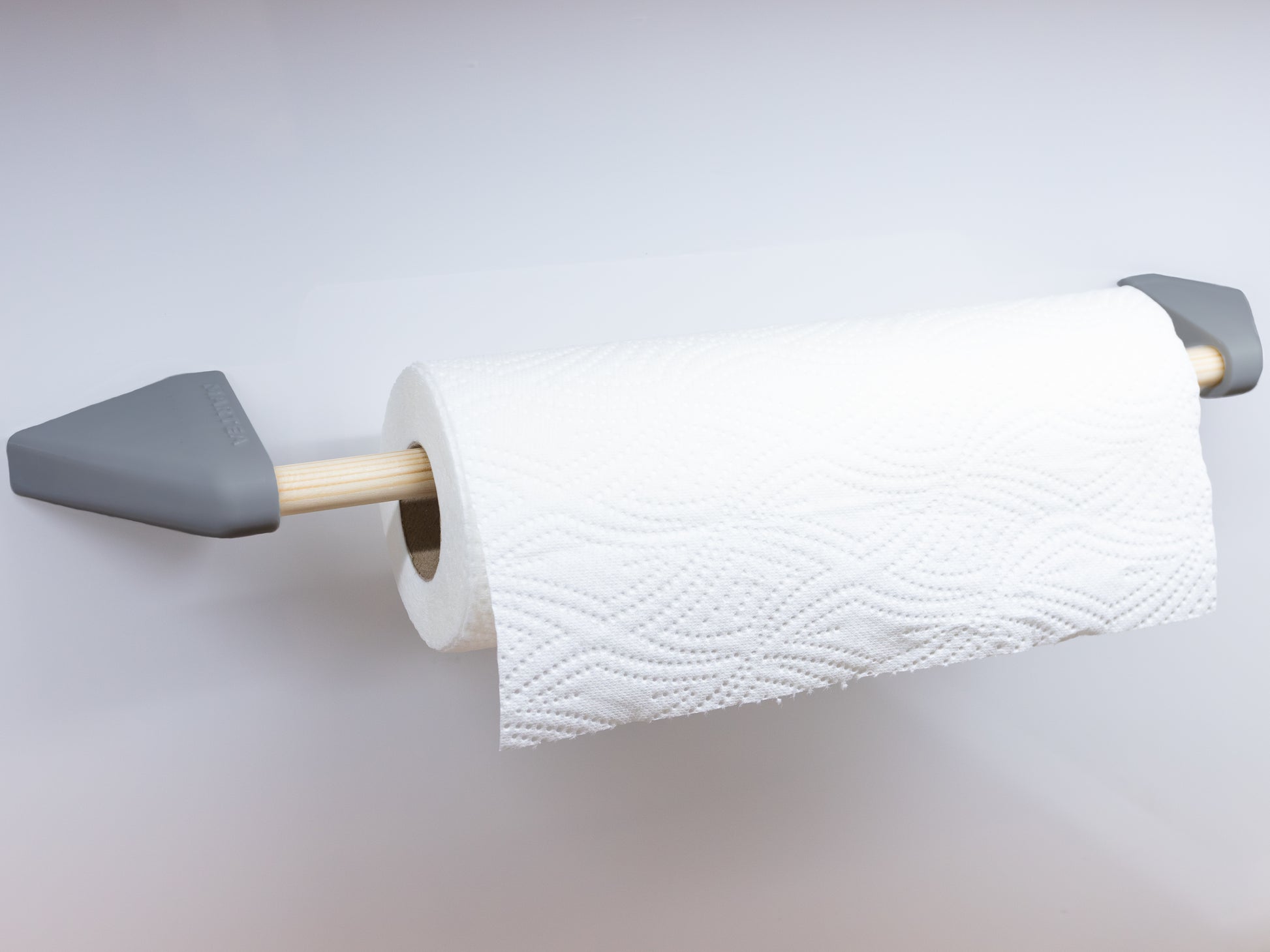 Zum Wechseln der Küchenrolle kann der Verschluss zurück gezogen werden, so dass sich der Holzstab seitlich herausschwenken lässt. Anschließend eine neue Küchenrolle darüber stecken, den Holzstab zurück schwenken und den Verschluss zudrücken bis er einrastet.
